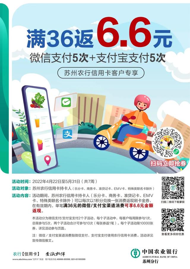 活動期間,蘇州農行信用卡持卡人(樂分卡、商務卡、準貸記卡、EMV卡、特殊類聯名卡除外)可以每次以1積分兌換一張消費返現刷卡金券,在有效期內,單筆滿36元的微信/支F寶渠道消費可享6.6元金額返現。