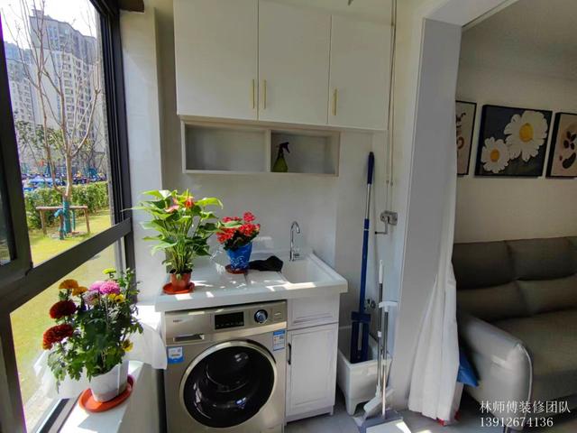 陽臺(tái)的光線很好,平時(shí)洗洗曬曬非常合適。洗衣機(jī)收納進(jìn)柜子里,統(tǒng)一美觀。平時(shí)還能種點(diǎn)綠植,詩意生活,超贊!