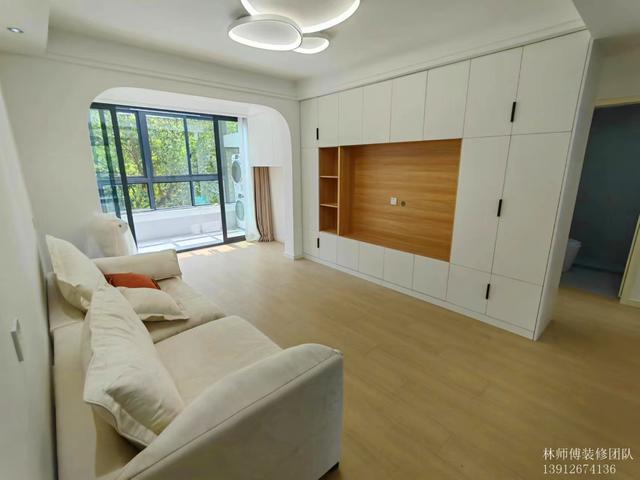 客廳做了收納式電視墻,超大的收納空間,鄰居看了都心動。奶白色的沙發、弧形的門框,讓整個空間顯得非常溫和舒適。家里都鋪了地板,視覺上弱化生硬感,營造出一個溫馨閑適的居住環境。
