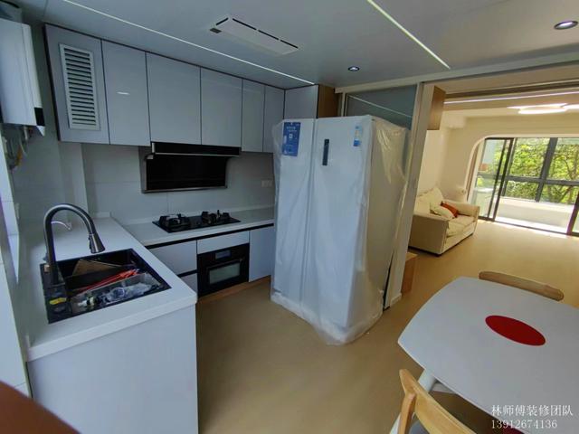 廚房和餐廳在一起,空間比較寬敞。白色為主的設計,讓整個廚餐廳上看去更加清爽整潔。與客廳之間也有移門隔斷,油煙不外跑。