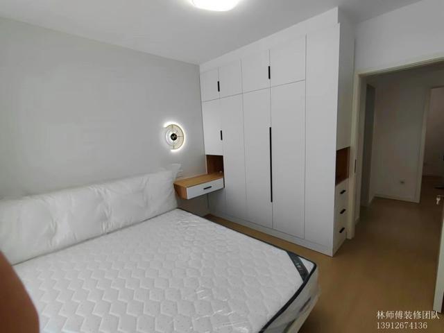 主臥非常舒適,延續了整個家里的白色風格,給人一種優雅的氛圍感,尤其是那盞床頭的壁燈。氛圍感拉滿!