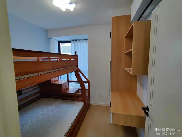 次臥高低床的設計,二孩家庭也能用。海豚造型的吸頂燈,可可愛愛。房間內還有書桌和書架,孩子在這里看書寫作業都很方便。
