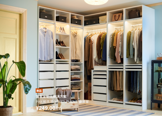 宜家經過調研發現中國消費者對量身定制的居家收納空間偏好,2024財年宜家中國正式推出適應中國消費者需求的宜家PAX帕克斯定制服務。以PAX帕克斯標準柜體為基礎,搭配以KOMPLEMENT康普蒙為代表的儲物內配,可根據每個家庭的實際空間情況、使用習慣,提供量身定制的加配柜體,以實現柜內外空間的充分利用,打造滿足中國消費者的個性化的宜家定制化收納解決方案。