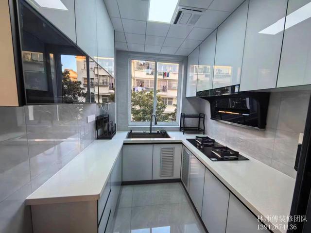 廚房U型設計,上下都是櫥柜,收納能力max,而且空間相對寬敞,可以滿足兩人一起使用,一人負責燒,另一人負責切和洗。