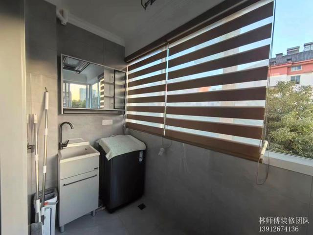 陽臺收納整潔,洗衣機,拖把等,擺放的井井有條。水池上面也安裝了鏡面柜,這不僅方便收納,有時候遇到洗手間不夠用,這里也可以臨時用來洗漱。