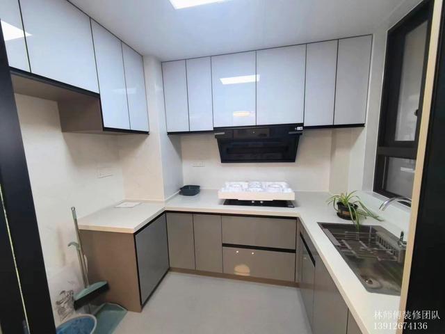 廚房U型設計,上下都做了柜子,收納能力非常高。冰箱內嵌設計,更加美觀。大單槽水池,鍋碗瓢盆統統可以放進來!