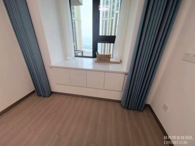 次臥帶飄窗,飄窗上做了大抽屜,增加家里收納空間,藍色的窗簾,清新夢幻,營造出一個靜謐的睡眠環境。