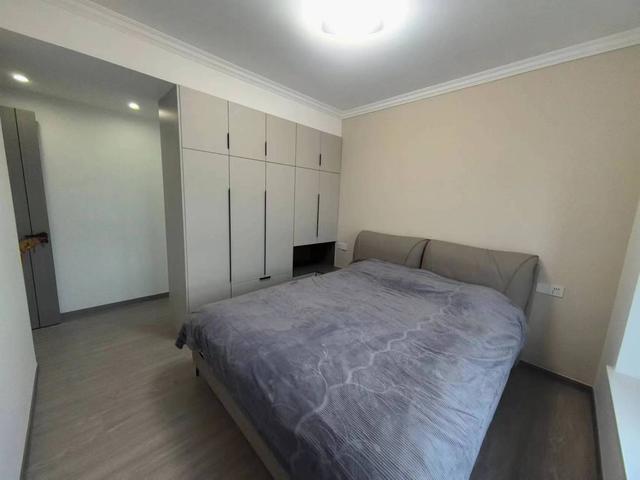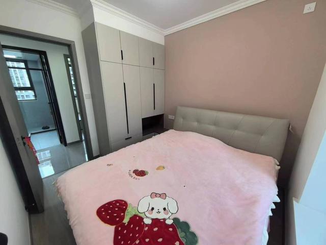 次臥是女兒房,顏色上一下子就活潑起來了,灰與粉的搭配,溫暖又時尚,還給孩子安排了可可愛愛的床品,真的是暖到心了。