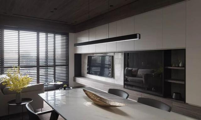 一些小戶型的客餐廳是連在一起的,那么電視背景墻就可以延伸到餐廳處,把電視柜和餐邊柜結合,讓小戶型擁有更多的儲物空間。