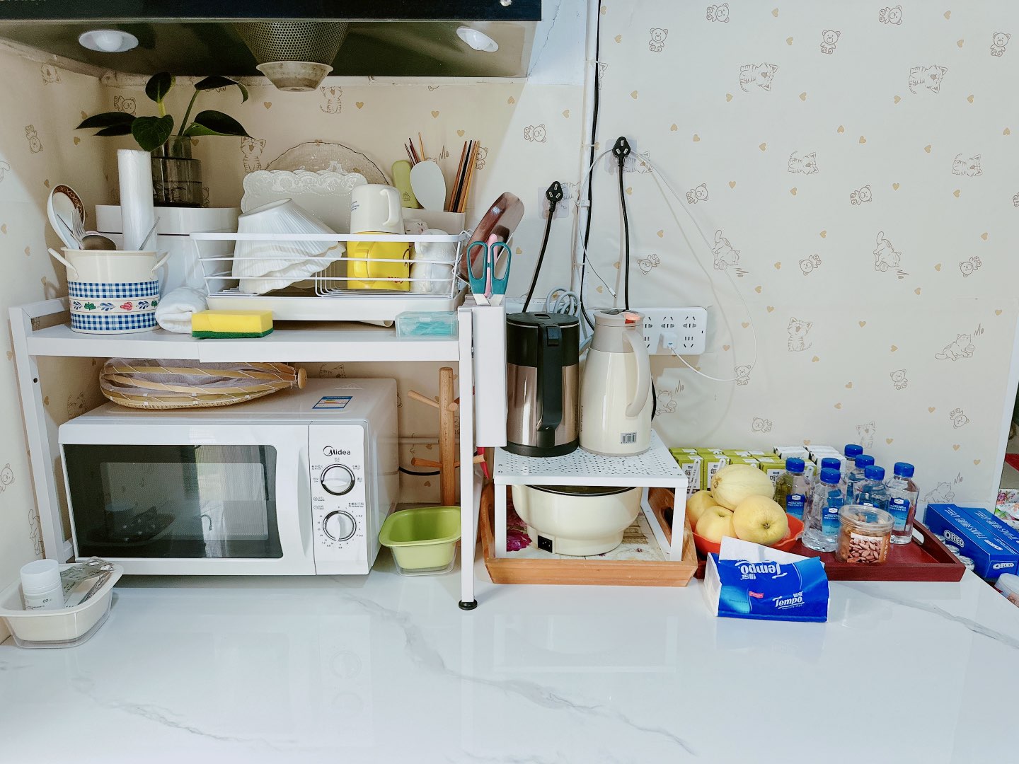 上周侄女看到我拿微波爐來姐姐租住的房子里,對我說:娘娘!你怎么什么都往ZZ租的房子搬啊!搞的像家一樣。我說就是家呀!雖然只有ZZ和JP阿婆在那邊睡一晚,還是想她們住的舒適啊!侄女又說:ZZ不是都在學(xué)校吃的嘛!又不在租住的地方吃。我說:有這些微波爐、卡式爐,想吃的時候用起來很方便呀!侄女和我媽的想法一樣,但是我覺得自有自便當(dāng)。上周和娃爸來把窗簾和門簾裝了下,買了之前同款貼墻紙想著貼下的,結(jié)果墻頂不好帖,貼的那會娃爸還在語音會議,結(jié)果被我貼的有點像狗啃的。娃爸說都貼這個顏色房間有點壓抑,說還是留一面白色好。姐們給了幾瓶噴了去霉點的,那天噴了是有效果,但是不勻稱。準(zhǔn)備網(wǎng)購的滾刷到了再刷下效果就好了。現(xiàn)在還是蠻喜歡跑姐姐租住的房子里來,我媽是個粗人,不太會收拾。今天下午家長會,把買的微波爐架子帶過來,順便收拾下。