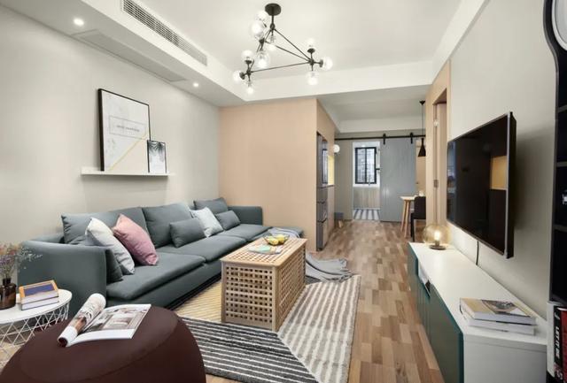 ▲客廳整體空間以暖灰色的墻面,布置灰藍色的布藝沙發,一張獨特的多頭球形吊燈,還有餐廳區域的胭脂粉色的墻面,整個客廳充滿了簡約自然的溫馨畫面感。