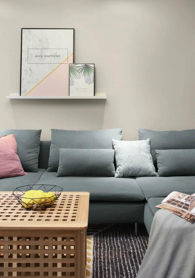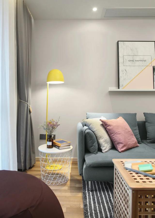 ▲沙發墻簡潔的灰色基礎,裝著一塊擱板,布置上簡約優雅的裝飾畫,還有灰藍色的布藝沙發,網籃式的邊幾、黃色落地燈,整個空間布置簡單舒適而文藝。