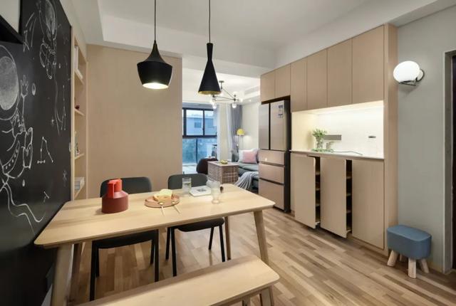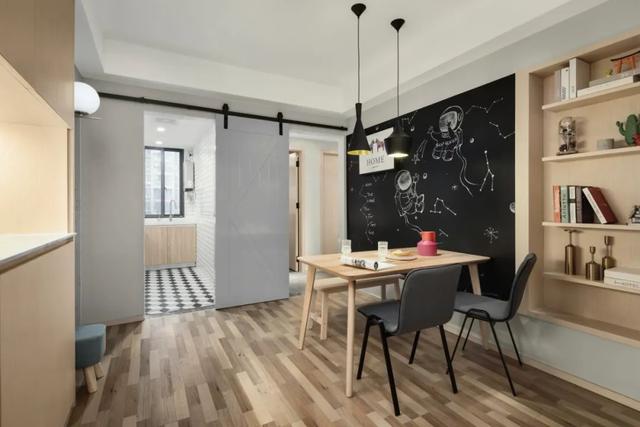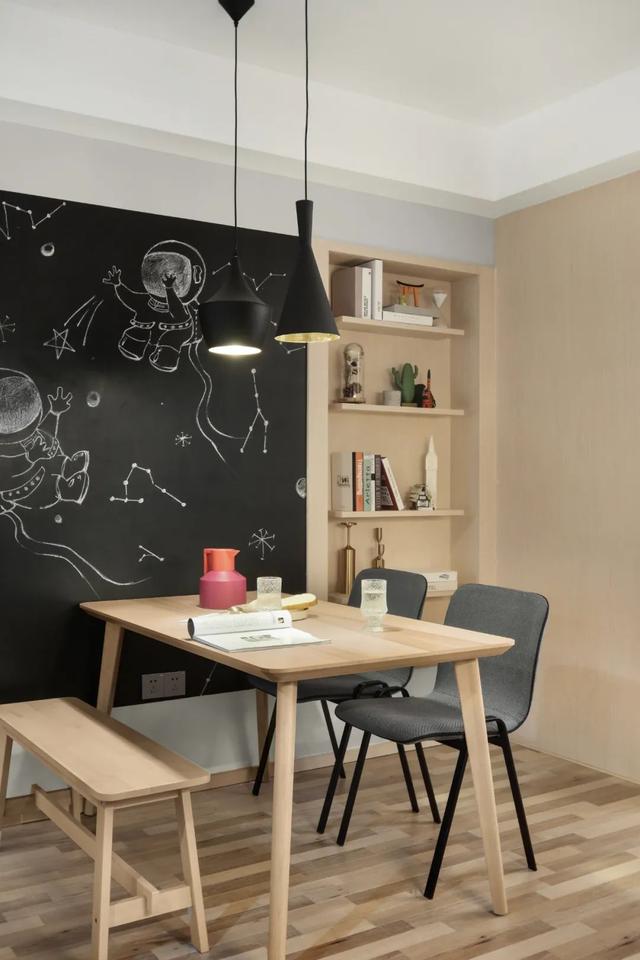 ▲餐廳背景墻做了一面黑板墻+收納書架,結合黑色的吊燈與餐椅,木色與黑色的結合,在原木色的餐桌與板凳布置下,營造出一種文藝舒適的自然氣息。