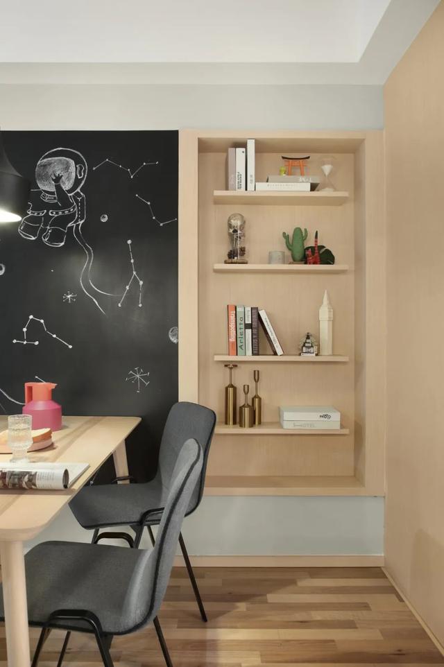 ▲黑板墻旁邊的入墻式多層書架,在胭脂粉色的基礎下,布置上書籍與各式各樣的裝飾品,也讓空間顯得充滿精致自然的清新與舒適感。