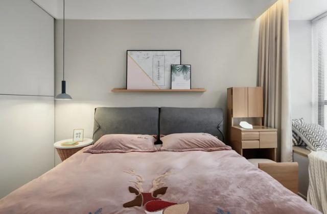 ▲臥室在灰色的空間基礎,床頭墻以木色的擱板,布置粉+灰調的清新裝飾畫,灰色布藝床鋪布置粉色床單,在簡約的空間里,營造出一種浪漫舒適的輕松感。