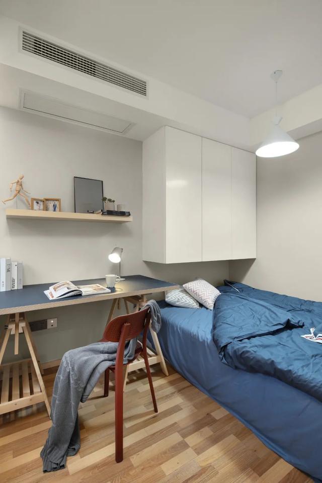 ▲書房定制的床鋪與吊柜,布置藍色的床單,創意造型的成品書桌,藍色臺面+藍色椅子的布置,結合書桌上方墻面的置物架,讓主人在家辦公的空間也顯得安靜優雅而舒適。