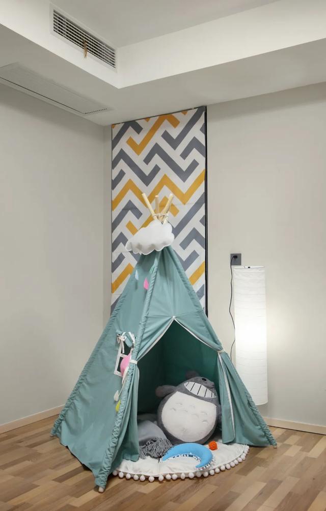 ▲兒童房暫時留空擺上小帳篷,布置成孩子在家玩耍的獨立空間。背景墻上的灰白黃拼色的造型,也讓空間顯得格外的優雅而文藝活力。