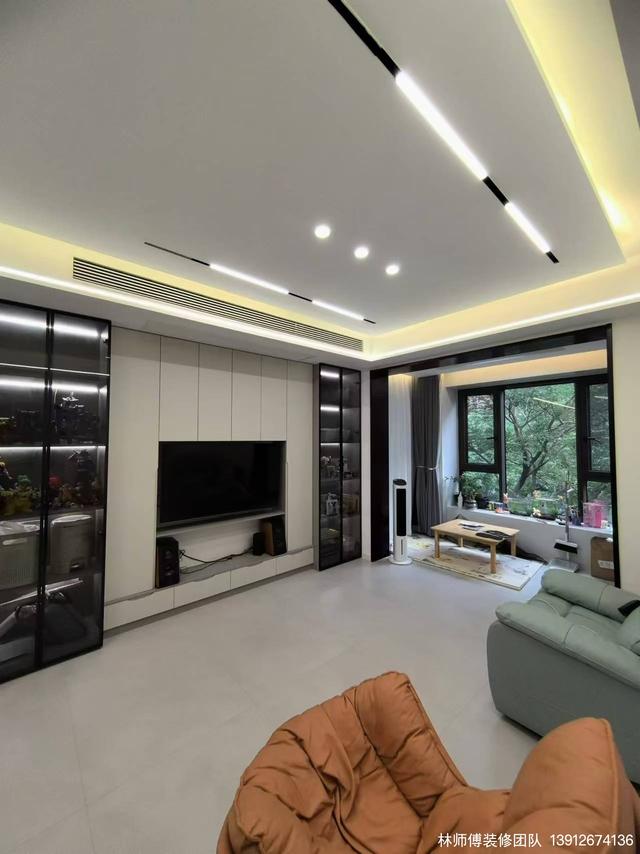 客廳以灰白為主,與黑色展示柜搭配起來,促成空間干凈利落的氣質。客廳是休息放松的地方,幾張簡約的單人椅,不設茶幾,讓空間充滿松弛感。電視墻也是收納式,內嵌電視,保持空間整潔,釋放更多活動空間。
