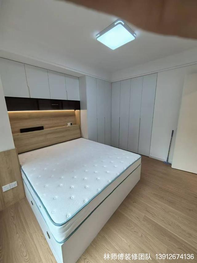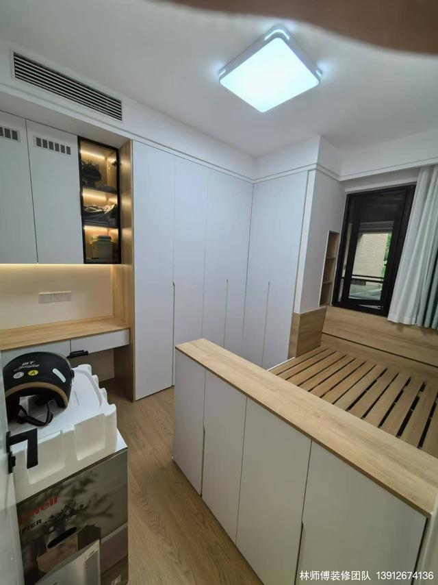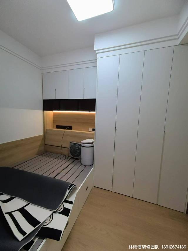 小房間簡約但使用,床頭上方是吊柜,除了可以收納,還能放東西,床頭柜都可以省了。
