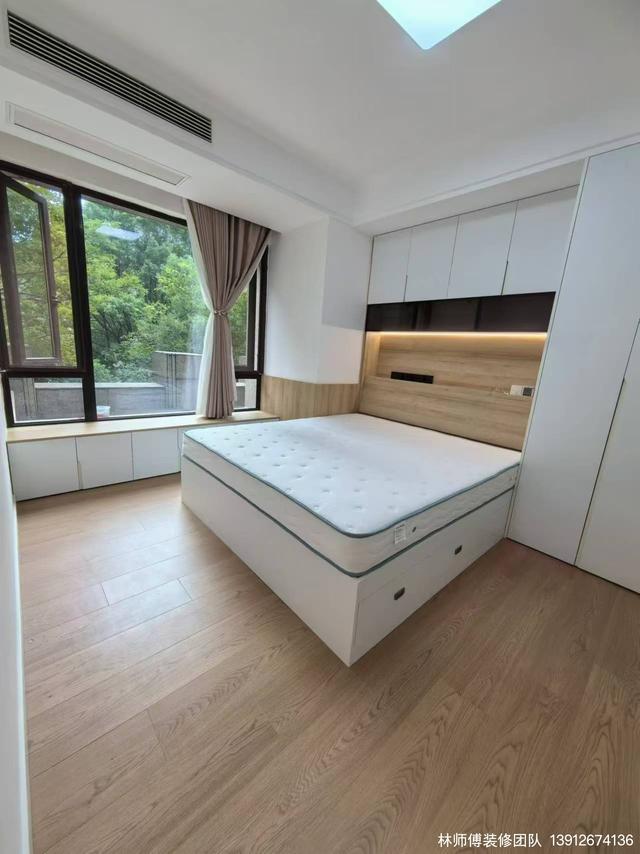 主臥以木色搭配白色,非常治愈系。床的整個背景墻都做成了衣柜,收納能力非常高。而且在床頭還內嵌了燈帶,讓整個空間增加了一抹柔和,超有氛圍感。