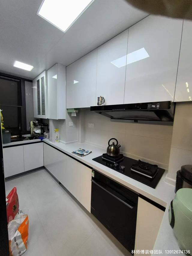 u型廚房設計,白色的臺面和櫥柜,讓整個空間看起來更加清爽干凈。另外,熱水器也用柜子擋起來了,更加美觀。