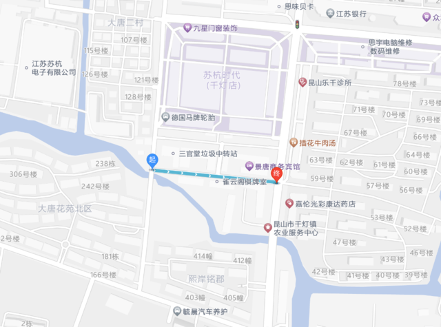 景唐支路西起昆山市千燈鎮恒升路,東至景唐北路,道路全長211.453m。