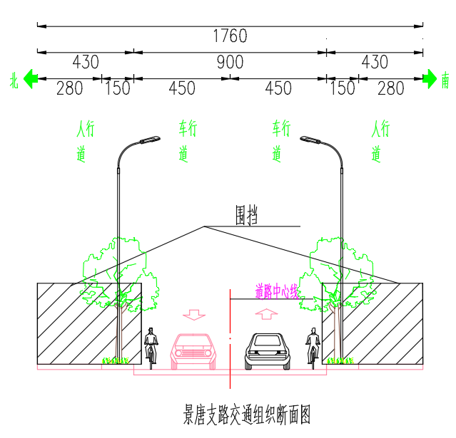 本次設計實施范圍為9m車行道,兩側人行道延伸至現狀沿街商鋪和圍墻前,并于人行道增設1.5m綠化帶保護現狀行道樹,路面結構為瀝青混凝土,設計速度為30km/h。