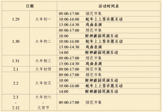 活動時間:1月29日-1月31日(正月初一至初三)上午: 09:00 -11:00下午:13:00 -15:00