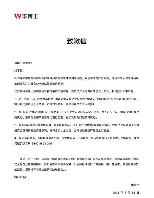 3月18日,針對門店被曝給過期食材“換簽續命”,華萊士官方微博發布致歉信稱,將涉事門店進行永久關停,不再對外營業,相關涉事員工予以開除。此外,即日起,公司對全國門店開展為期30天的衛生安全自檢與突擊抽查,每天進行公示,確保運營標準嚴格執行。主動配合相關監管部門進行檢查,對于發現的問題及時改進。