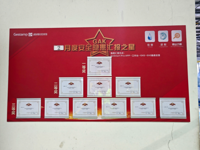 為充分調動企業(yè)全員參與安全積極性,海斯坦普汽車組件(昆山)有限公司制定隱患報告獎勵方案,在內部GeSmart系統(tǒng)上線隱患反饋模塊,實現“隱患反饋-跟蹤-驗收”全流程數字化。常態(tài)化開展“全員安全隱患啄木鳥行動”,鼓勵員工利用反饋模塊參與隱患提報。建立月度隱患報告評比機制,按照上報隱患數量排名,每月對排名前10名上報人員進行現金獎勵。同時,將隱患反饋納入團隊KPI考核,評選年度優(yōu)秀安全團隊。2024年以來,共收集有效隱患2426條,累計發(fā)放獎金21000元,隱患整改率達96.8%。