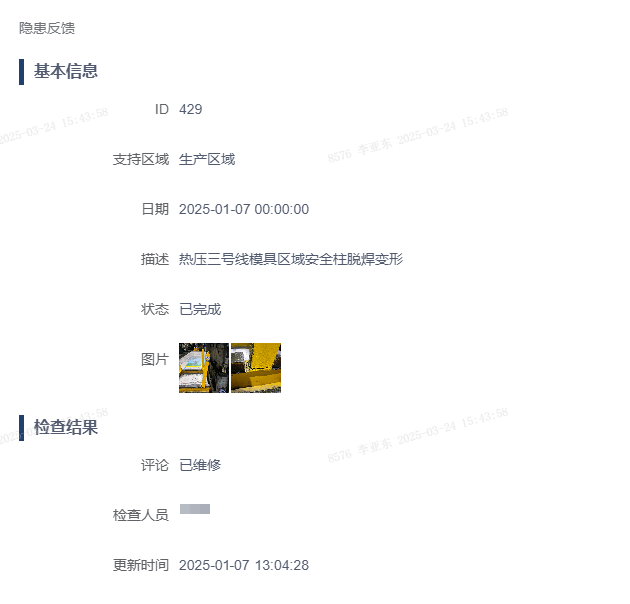 案例二:2025年1月7日,該企業(yè)生產崗位一員工在熱壓3號線模具存放區(qū)發(fā)現熱壓模具防護柱變形脫焊,存在模具傾翻的風險。該員工立即在信息化平臺反饋該隱患。維修部門立即安排人員對防護柱進行維修,確保模具存放安全。事后,給予該員工現金獎勵100元。