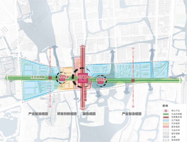四組團:服務組團、研發創新組團以及兩個產業智造組團