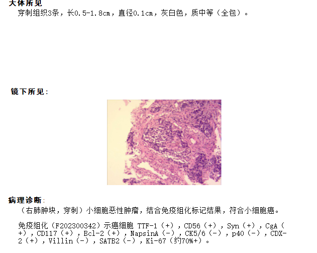 操作很快完成,術中術后都沒有出現血氣胸,老先生精神狀態良好,也沒覺得胸悶胸痛。3 天后病理報告出來了:小細胞癌!原來這不是結腸癌肺轉移,而是老爺爺患上了第二種原發腫瘤,是肺里地地道道的 “原住民”。