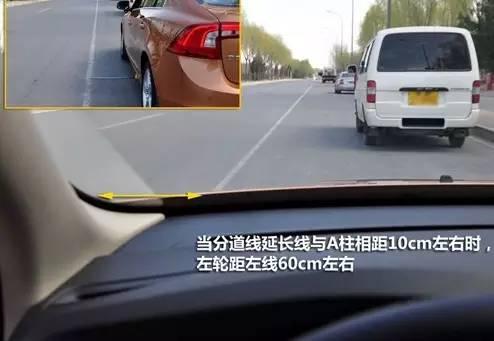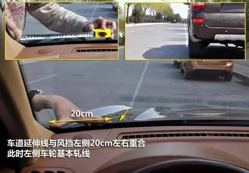 當你以合適坐姿平視前方時,能看到左車道延伸線與車頭結合點距離擋風玻璃左側A柱大約20cm左右時,這時左車輪就基本壓線了。