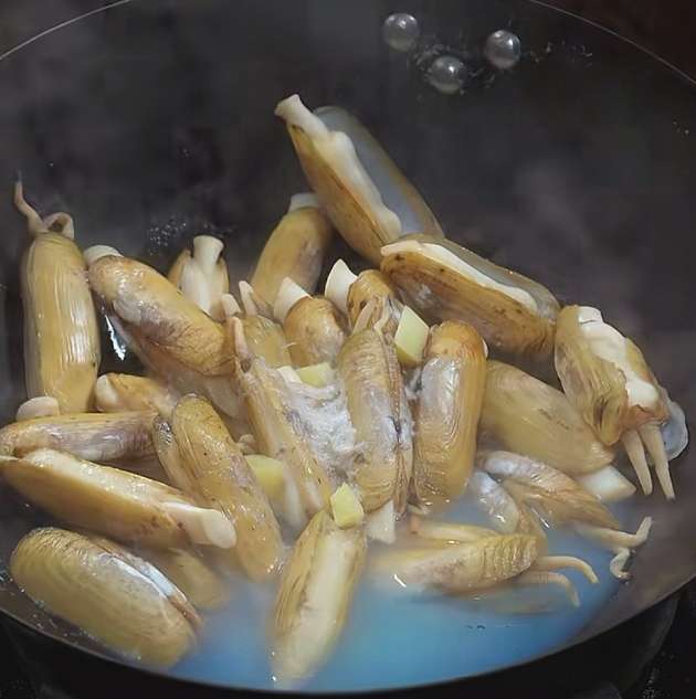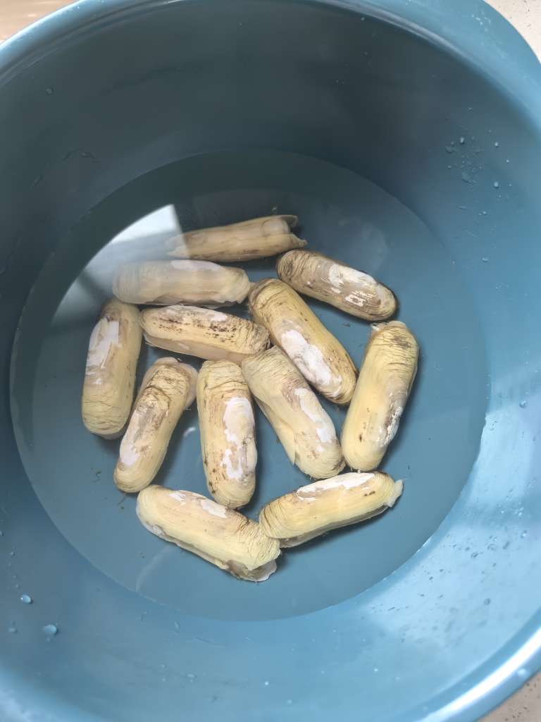 蟶子放鍋里,放姜片,不要放水,直接開鍋煮一分半鐘,起鍋,放涼可以把蟶子肉剝離!