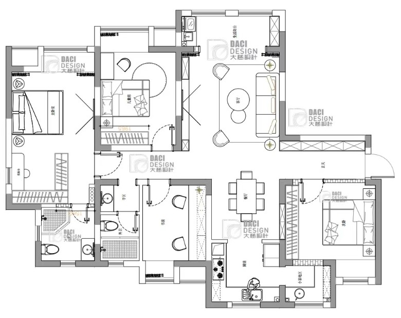 無論房間多大,一定要顯得寬敞。不需要繁瑣的裝潢和過多家具,在裝飾與布置中最大限度的體現空間與家具的整體協調。造型方面多采用幾何結構。
