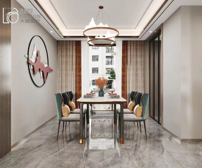 餐廳地面使用高光澤度的石材,提升了整個空間的質感。大理石材質的餐桌與混色餐椅顯得別有風味,工業風的吊燈詮釋著現代風格的理性魅力。