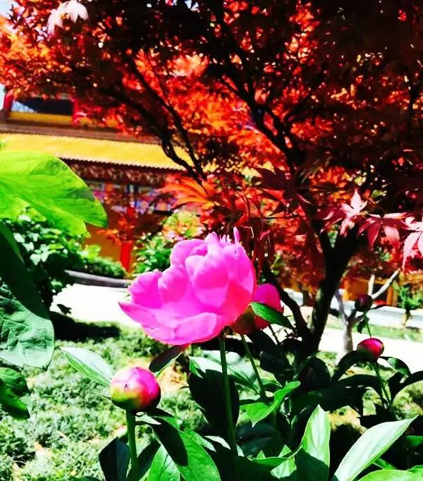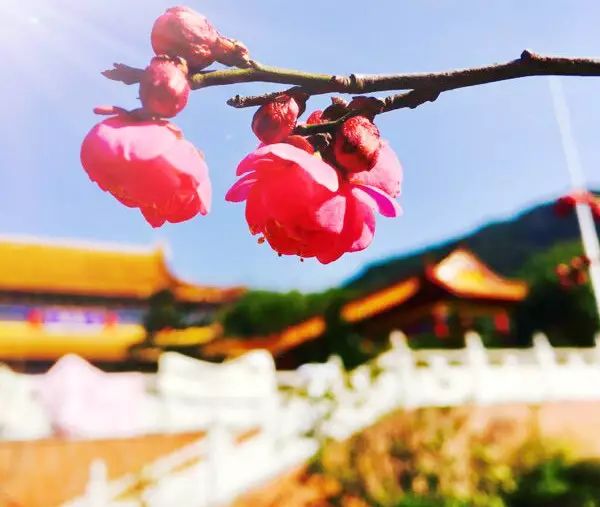 殿前庭院回廊環繞、假山疊瀑,各種花木四季繁華爭艷,特別是數百棵紅梅傲雪芬芳,四月的牡丹盛開堪稱“花王”。山中泉水泠泠、終年不絕,流淌于池沼間,伴游人穿行回廊間。