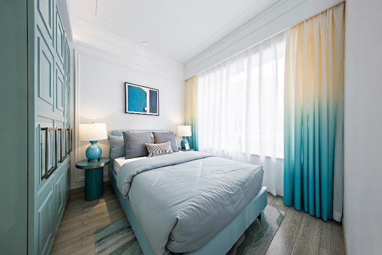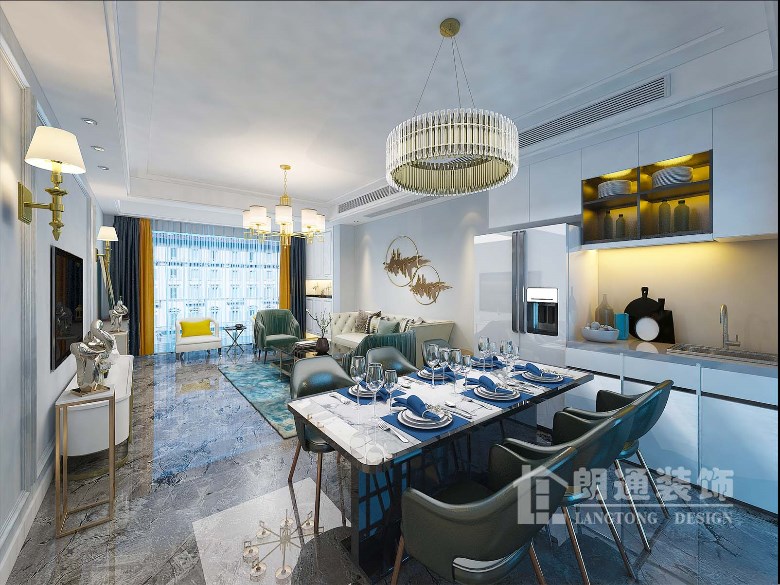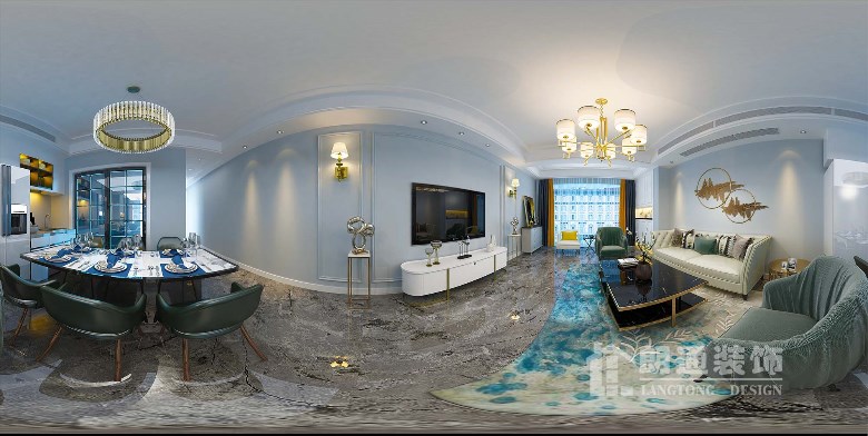 設(shè)計(jì)理念:女主人是個(gè)充滿浪漫想法的女人,所以設(shè)計(jì)師用了夢(mèng)幻藍(lán),霧霾藍(lán)色作為基礎(chǔ)色來打造他們的婚房,并搭配精致的燈具和軟裝來還原女主人的夢(mèng)想家園。