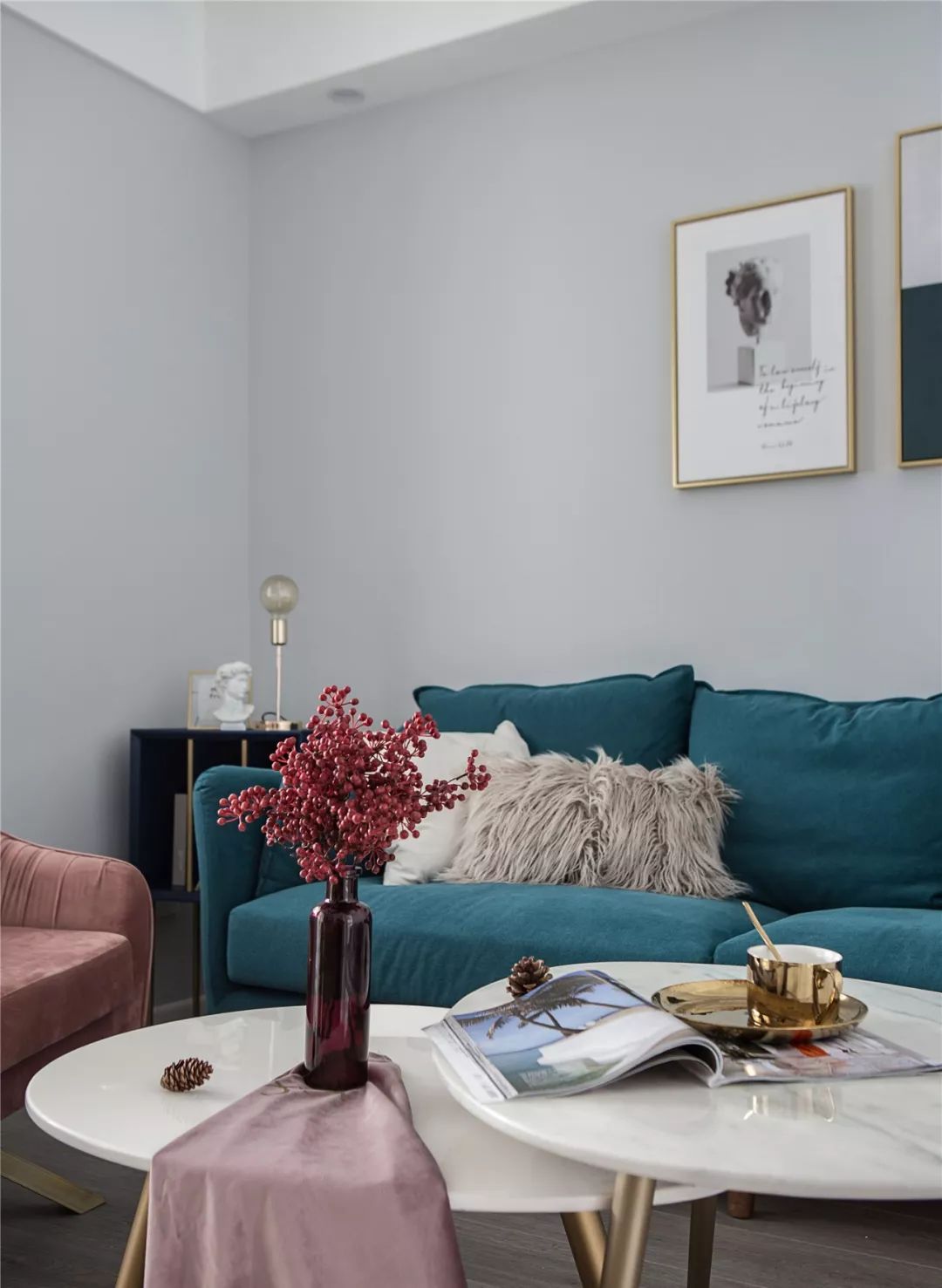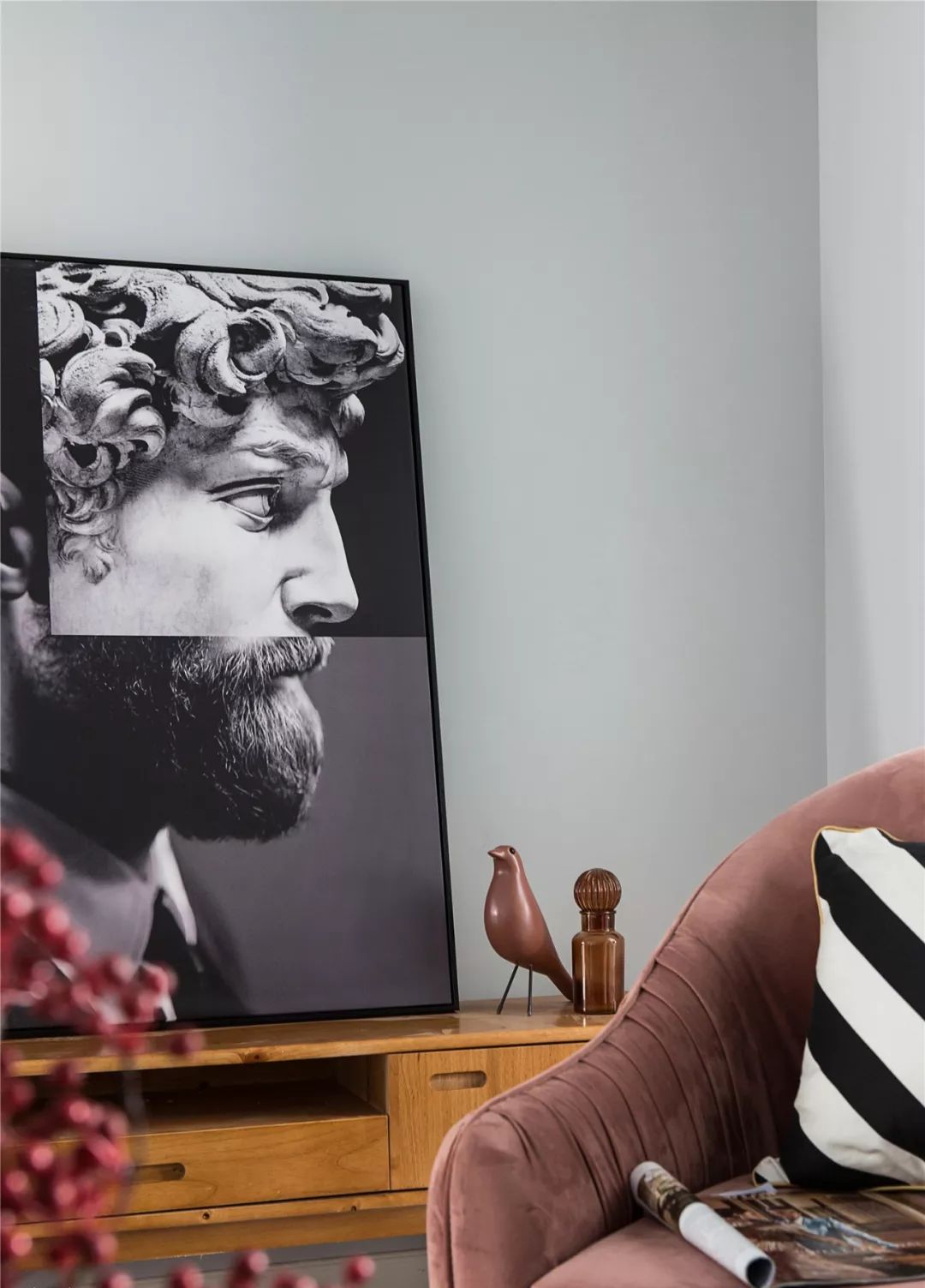 臥室到客廳有堵墻,采光不足,有道是客廳空間狹小,我們將臥室和客廳之間的隔墻進行拆除,將臥室的自然光納入客廳空間,視覺上擴大了整體空間,撞色的沙發(fā),帶著自然氣息的抱枕,飽含詩意的裝飾畫,生活仿佛因為有了這些豐富的家具配色變的飽滿起來,沙發(fā)里、茶幾上寧靜與溫暖的交織,買啤酒的時候順手買了一束花,一起期待理想的生活