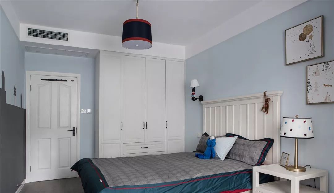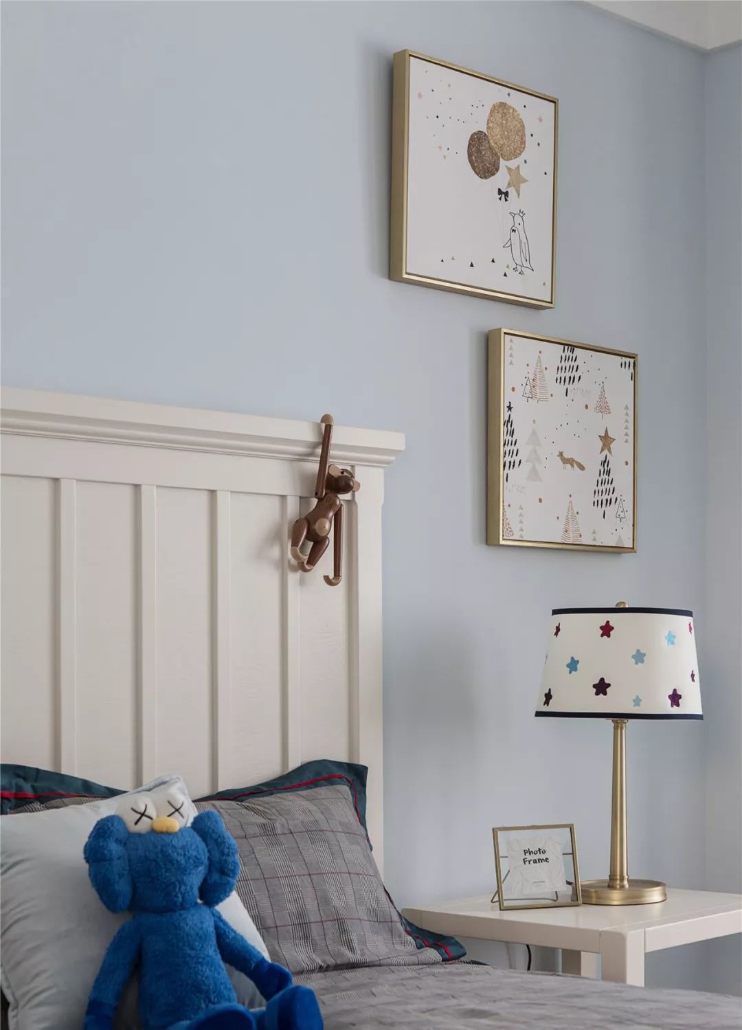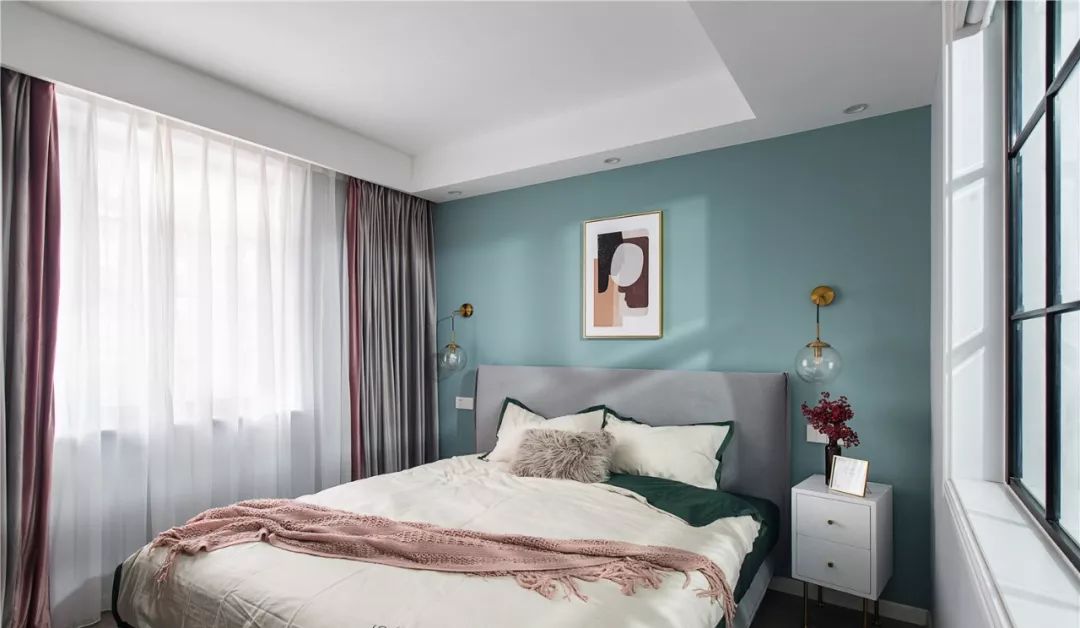 延續(xù)了整體清新自然的視覺定調(diào),床品選用了雅致的灰色調(diào),灰度的質(zhì)感與舒適度呼應著空間主人的氣質(zhì)與品位,背景墻選用了大面積的薄荷綠,清新亮麗,更添一份藝術(shù)的韻律,為主人營造出春日里閑暇時光的氛圍。