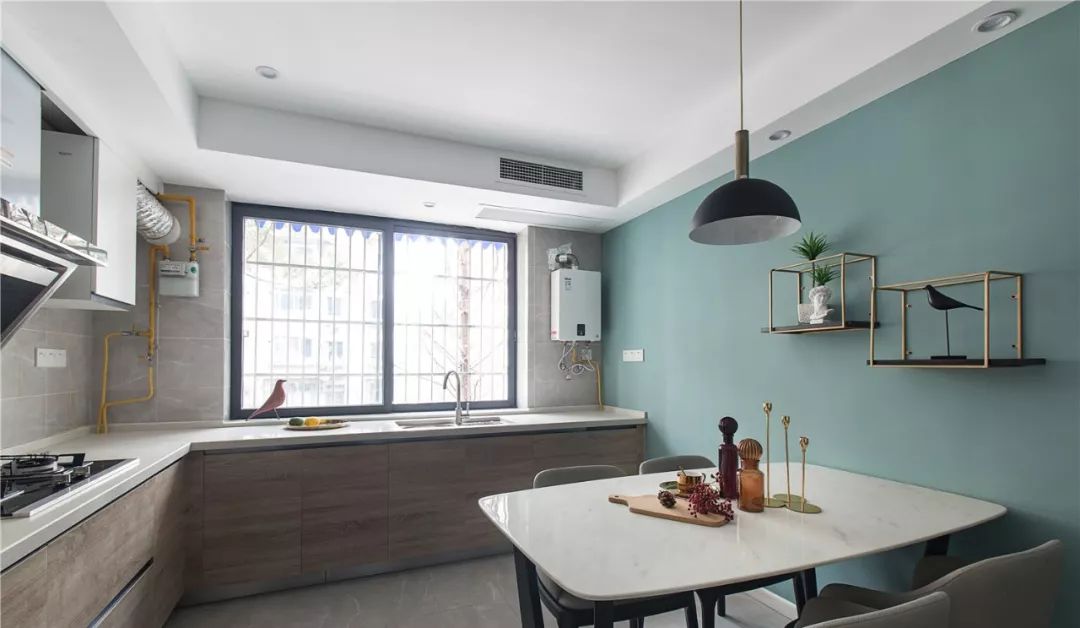 將廚房原來的推拉門拆除與餐廳相結(jié)合,從備餐到用餐,合理的家居動線設計,讓生活變得更加輕松,整體硬裝非常簡單,僅僅是綠色墻面,搭配原木色系的墻磚、櫥柜和軟裝搭配,低飽和色彩形成一種強烈的空間感,適度的留白手法將視野拓展,無限延展空間