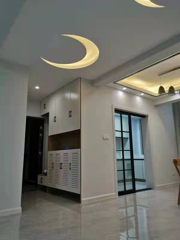 ▲客餐廳在一個(gè)空間,用吊頂作區(qū)分。月亮型的燈具真的是非常有個(gè)性。