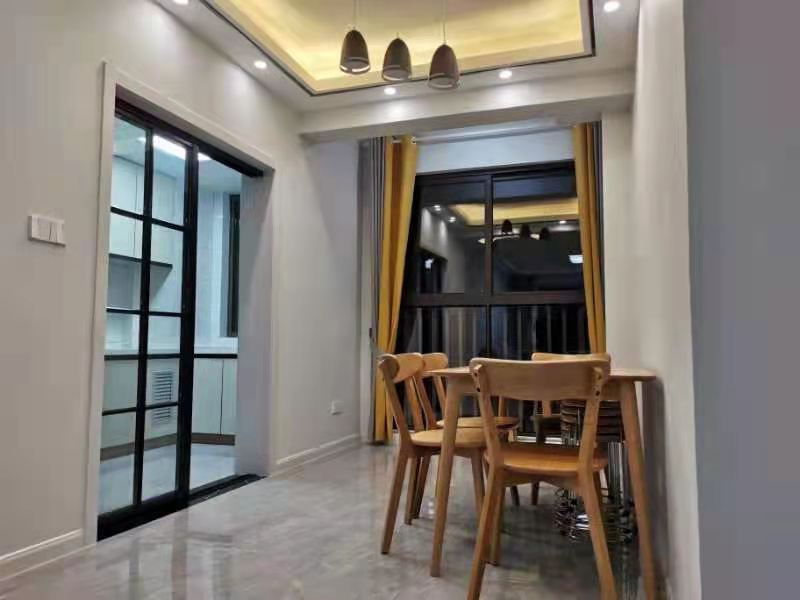 ▲餐桌靠墻節(jié)省空間,個(gè)性吊燈增加用餐氛圍。玻璃移門增加通透性,采光也會(huì)更好。