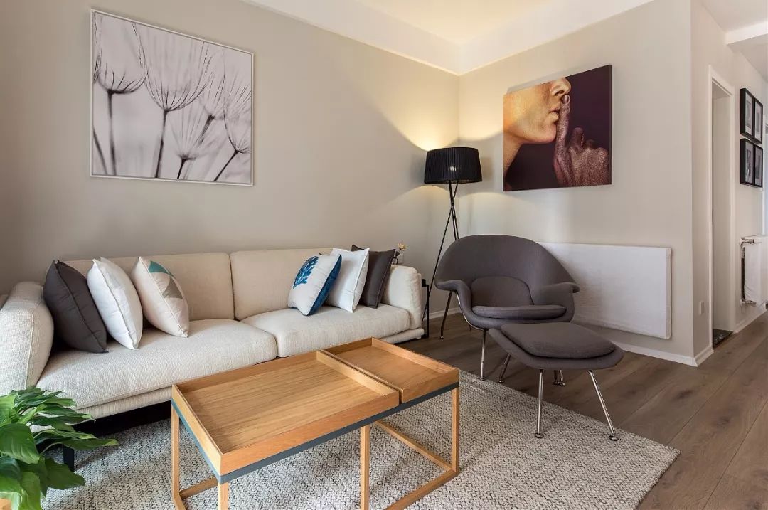 將木色和白色作為主打色,其他的家居配飾,則與整體格調和諧統一。畫作平衡了淺灰色沙發的色彩,大小不一的茶幾拼接在一起更加充滿趣味性,顯得格外的輕松、大方。