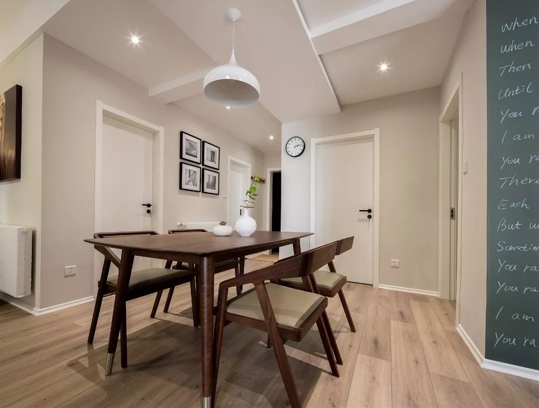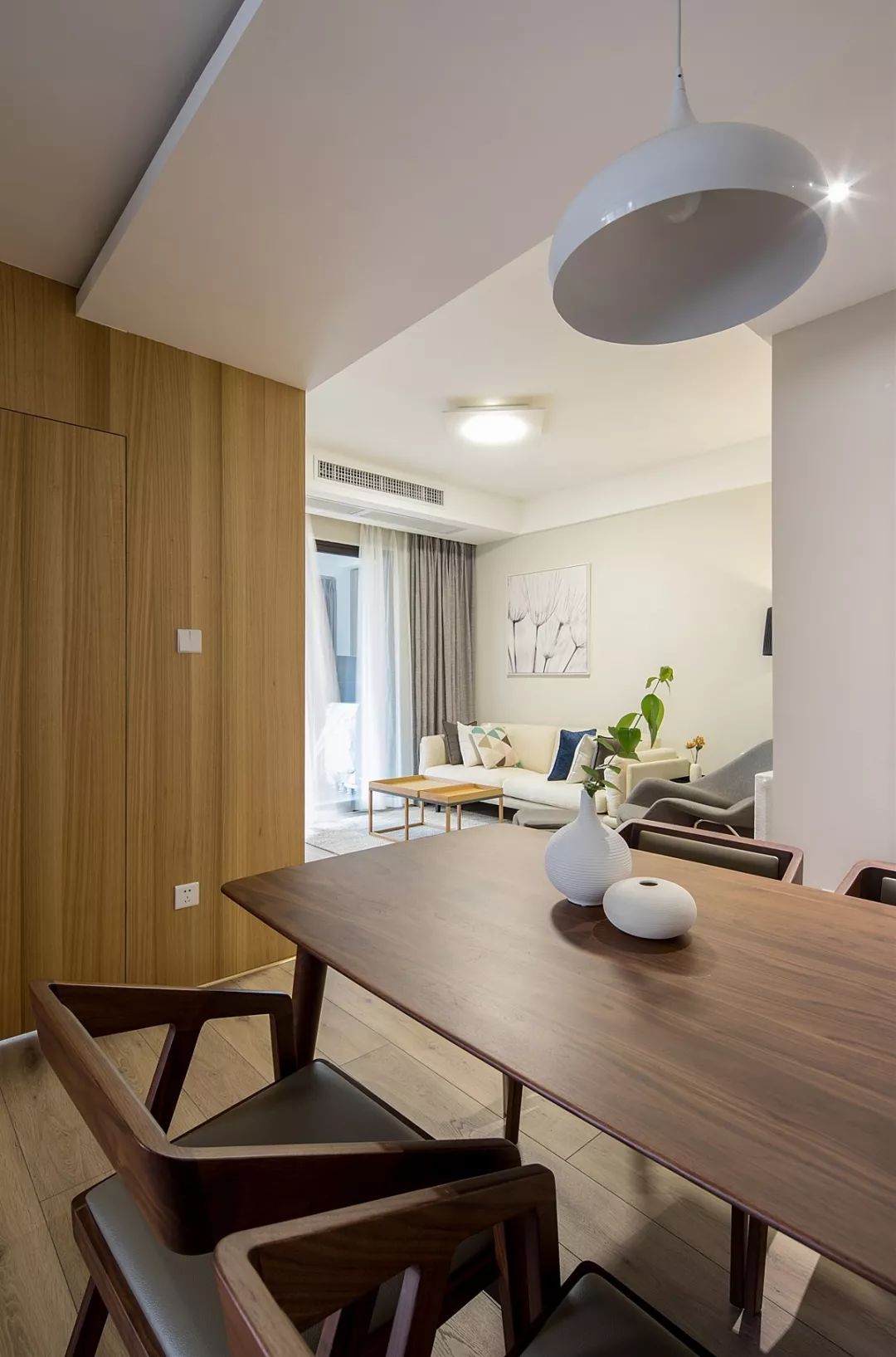 采用原木材質的餐桌,配合白色墻體,空間營造出來最質樸的溫馨感。深色的色彩使空間更加的穩重而有韻味,干凈利落。