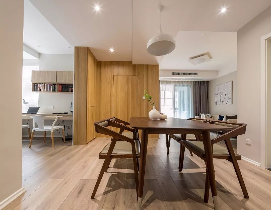 餐廳在通向臥室、廚房、書房、衛生間、大門的正中間,是區域功能利用最大化,即隔絕各個功能分區,有不顯得空間狹小。