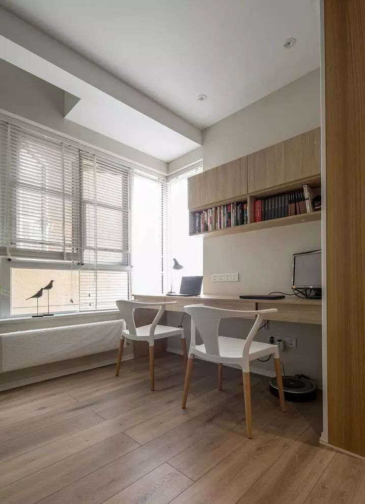 書房定制一體式長條書桌,可以提供兩個人同時辦公的便利。開放的環境,坐在這里曬著太陽看看書、喝著小茶聊著天,真是愜意無比。