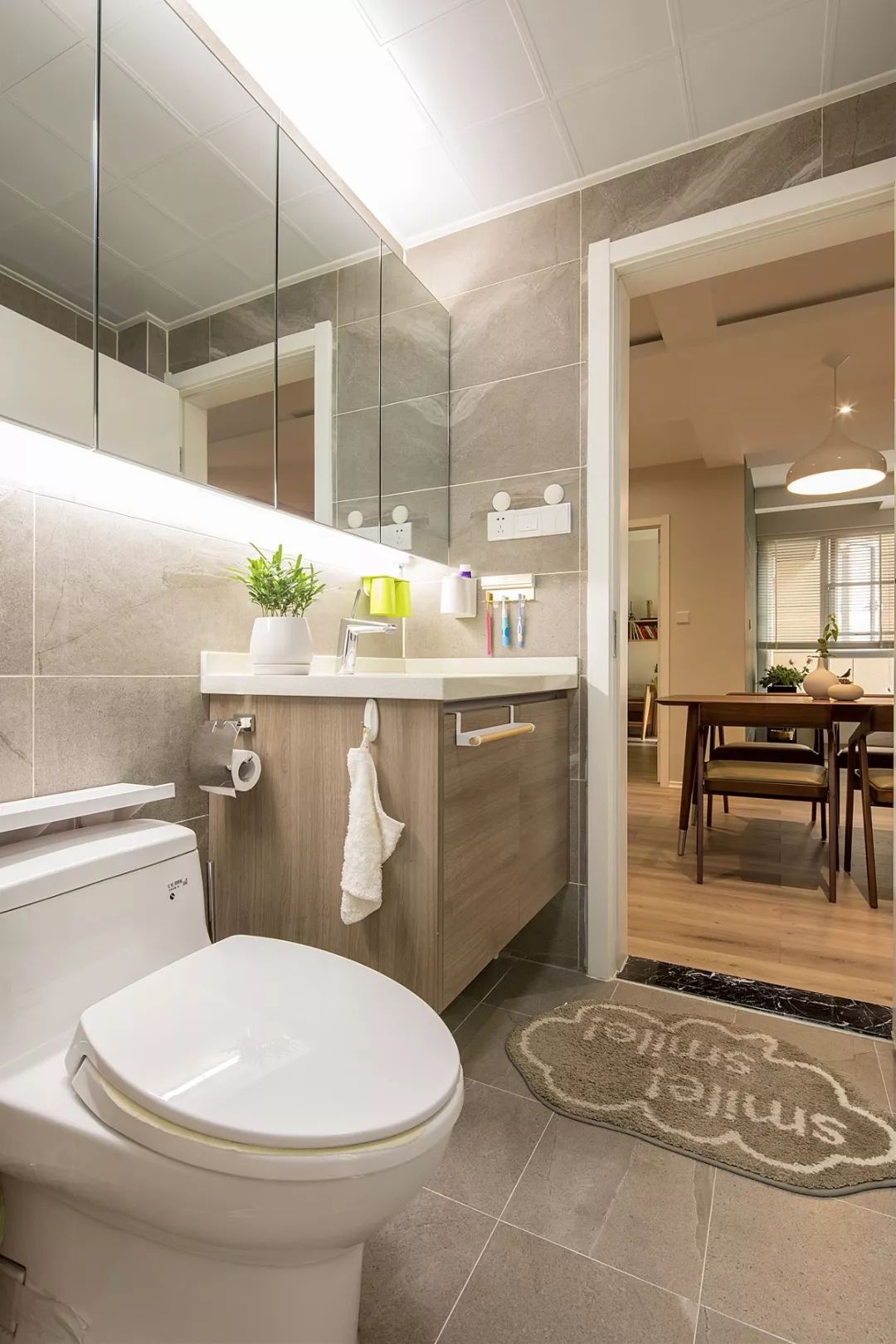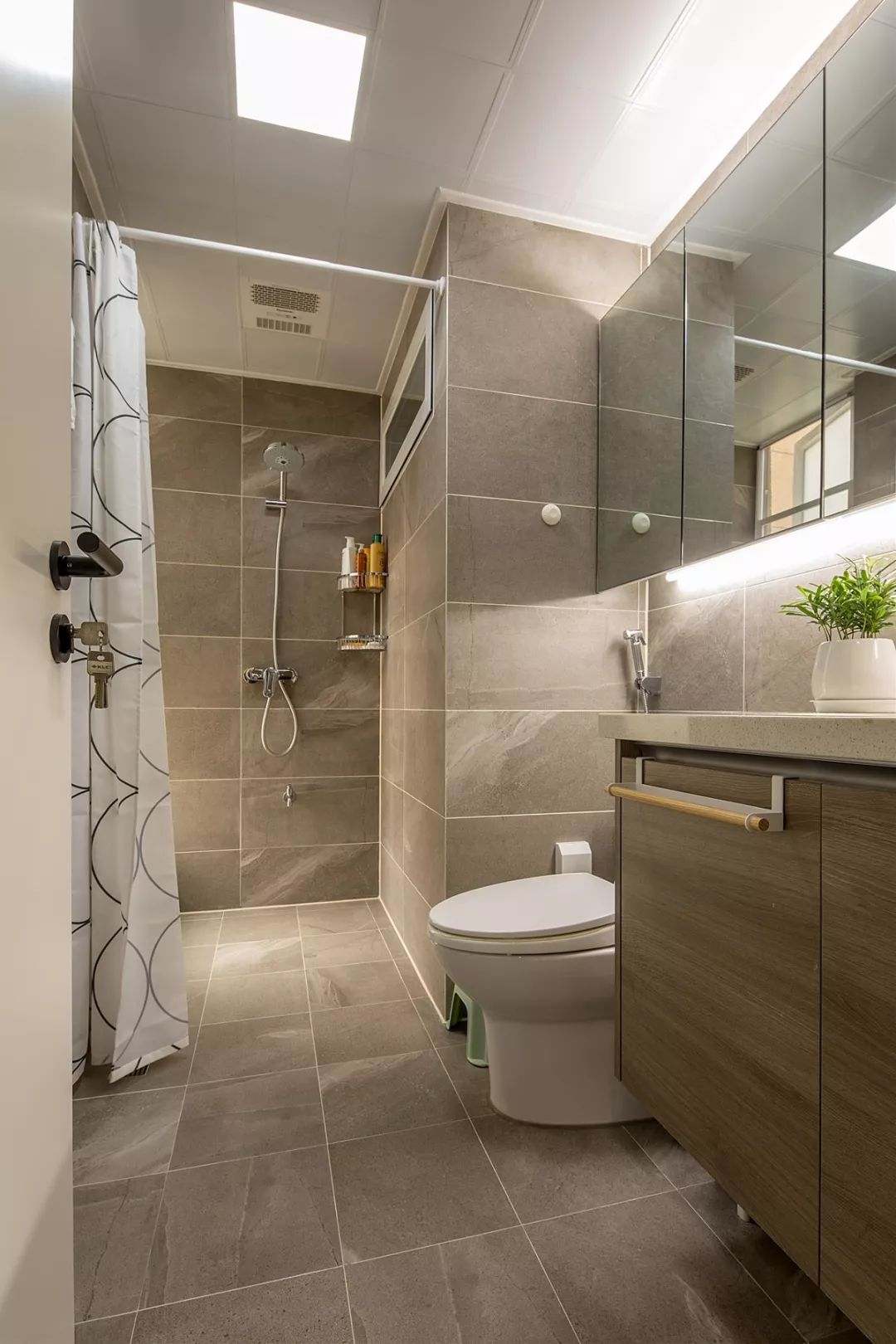 衛生間墻面和柜面都是用的淺灰色系,衛生間內部的空間還是比較寬敞的,灰色系的墻地磚結合起來,營造出淡雅、精致的感覺。