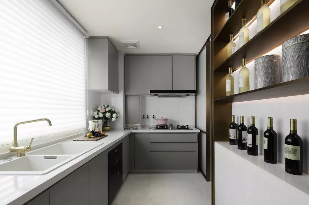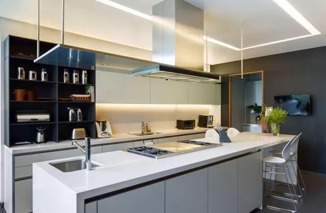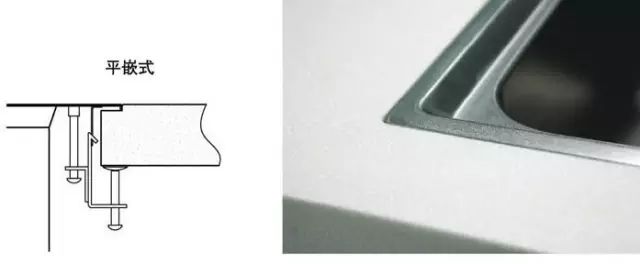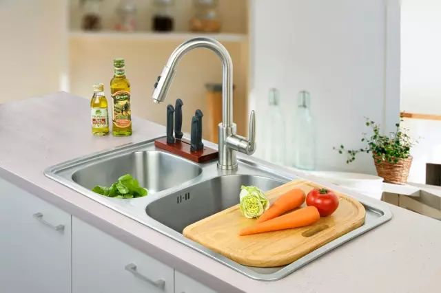 相對(duì)比前兩種,臺(tái)下盆清理起來,就相當(dāng)于福利了。它是需要把水槽安裝在櫥柜臺(tái)面下面,整體融為一體后,臺(tái)面上的水、飯?jiān)⒉巳~輕輕一抹也就到水盆里了。